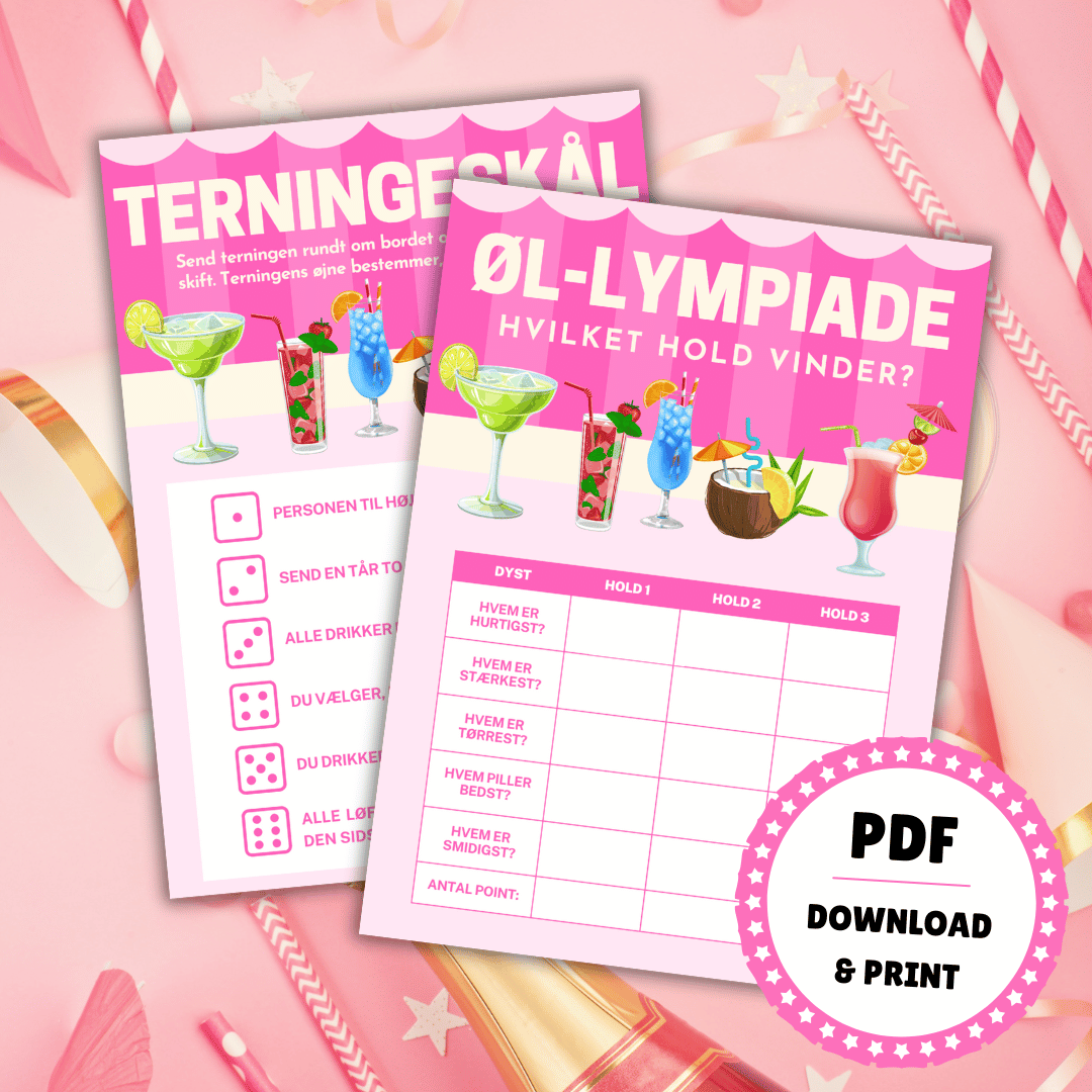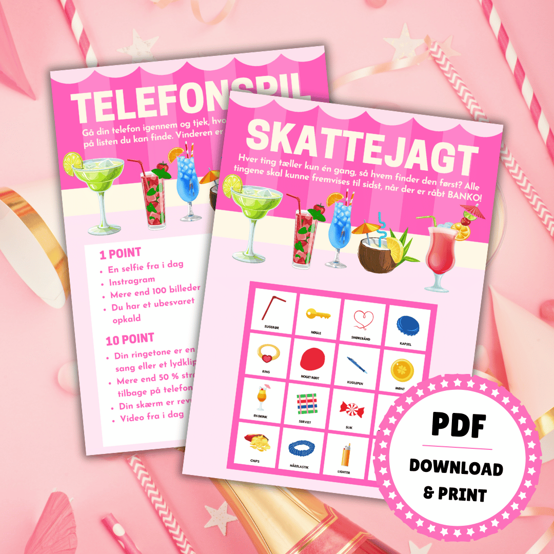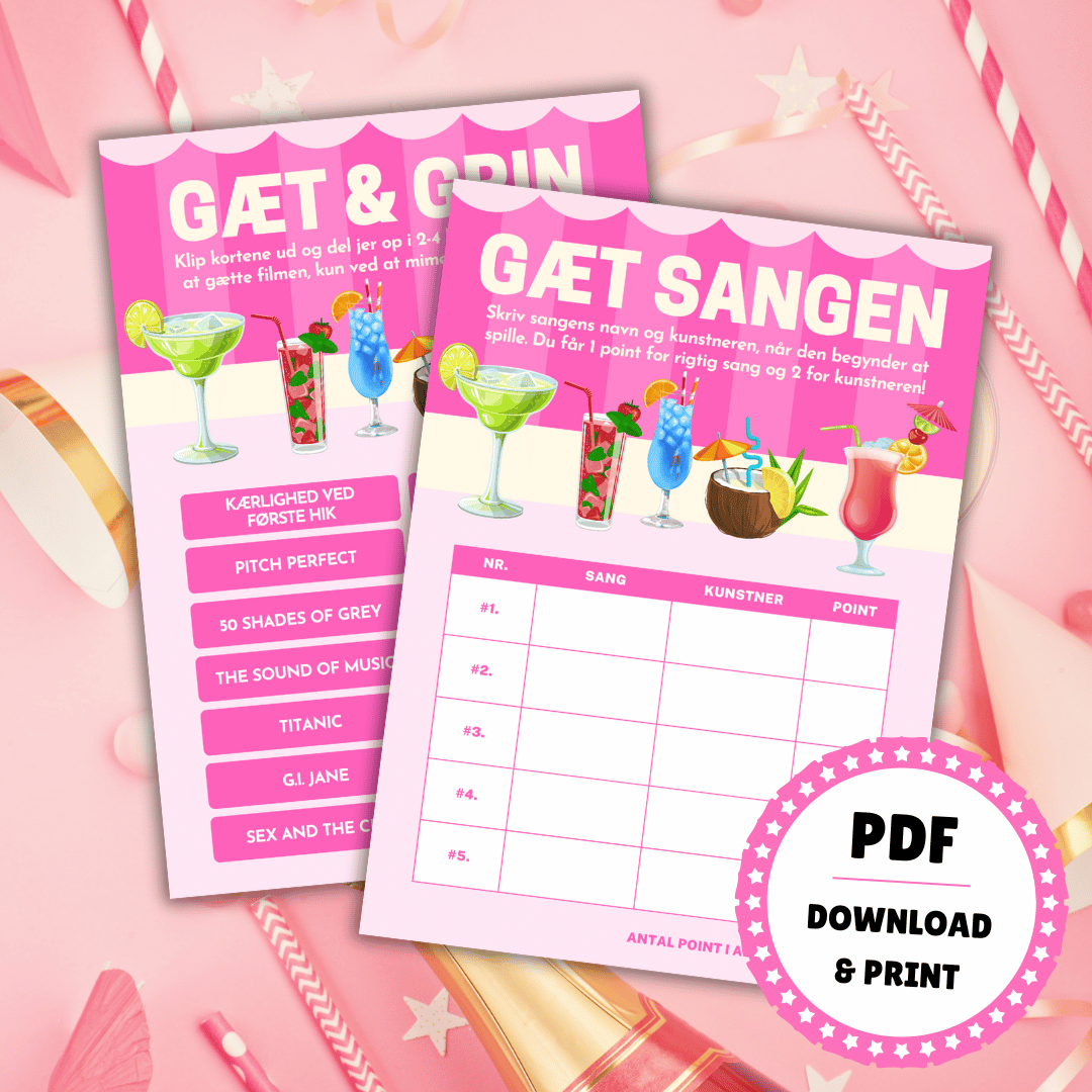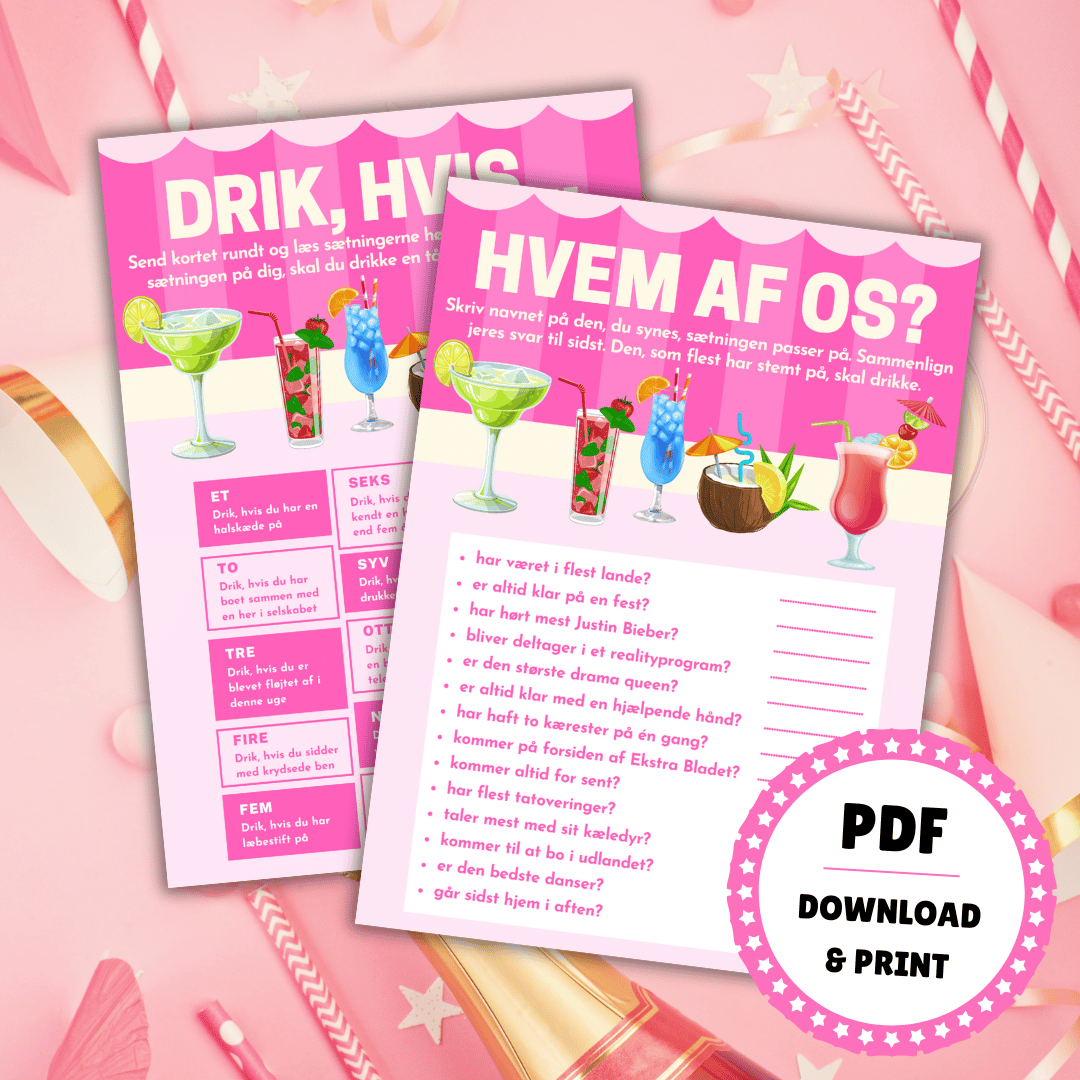 Alle kan være med til at quizze, gætte og grine i de sjove spil, som nok skal sætte gang i lattermusklerne. Husk kuglepenne til alle og masser af præmier – så er I klar! Spil og festlege er designet i PDF og er lige til at downloade og printe ud. PDF-filerne kan ikke redigeres. Se også de andre festlege til en aften med veninderne – klik her!