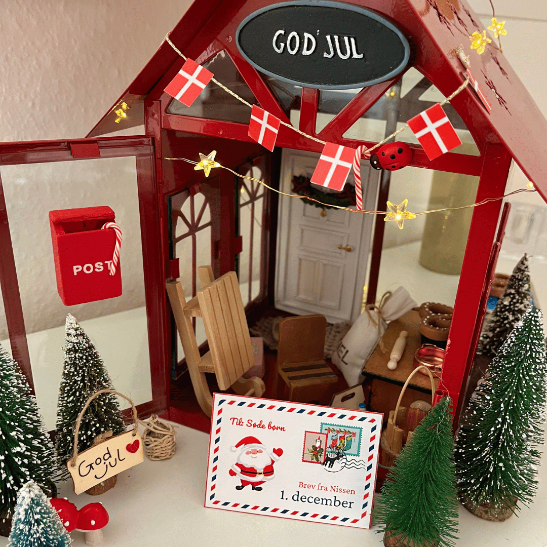 Selv om nissen her på billedet bor i det fineste lille nissehus – så er det altså kun brevene, som du får med i pakken. Alt det, der ikke kan komme ud af en printer, skal Nissen nok selv samle sammen, så det bliver rigtig hyggeligt!