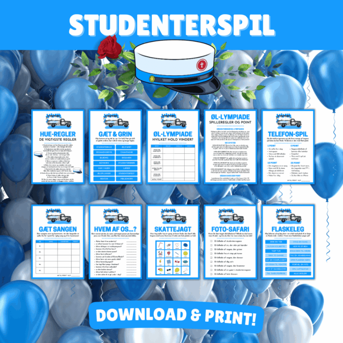 Titel: 8 sjove spil til turen i studentervogn – hf – Forfatter: Lou Noire – Forlag: Pretty Page – Udgivelsesår: 2022 – 1. udgave – Format: PDF – 12 sider.