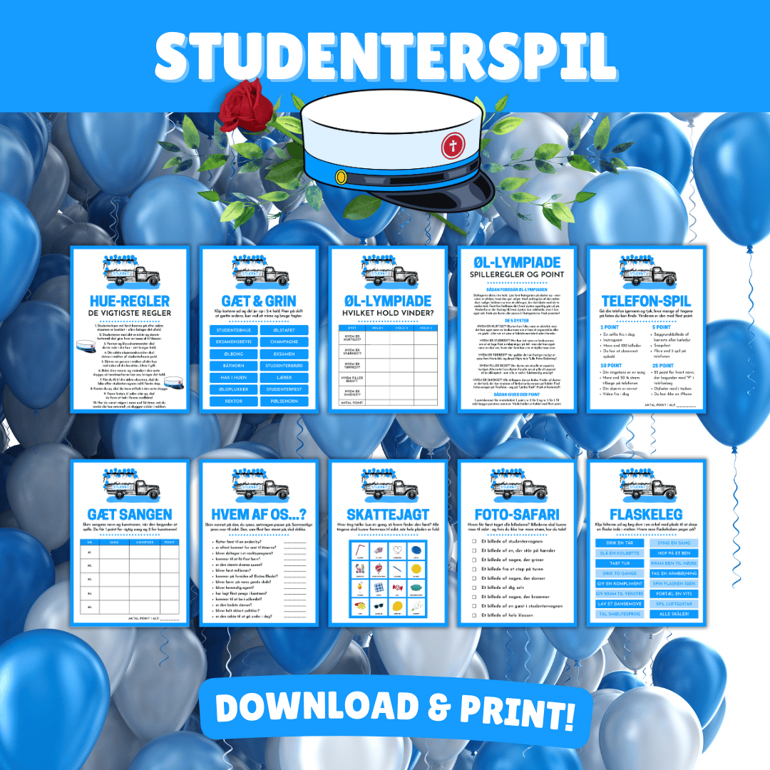 De sjove spil kan også bruges til et af de mange stop på vognruten til studenterkørsel. Er du en forælder, der gerne vil lave et hurtigt og sjovt indslag, når studentervognen kommer forbi, så send de nybagte studenter ud på den sjove skattejagt eller få dem til at dyste i en gang ØL-lympiade. Husk, at studenterne skal besøge mellem 15-30 hjem, alt efter klassens størrelse, så hold det kort.