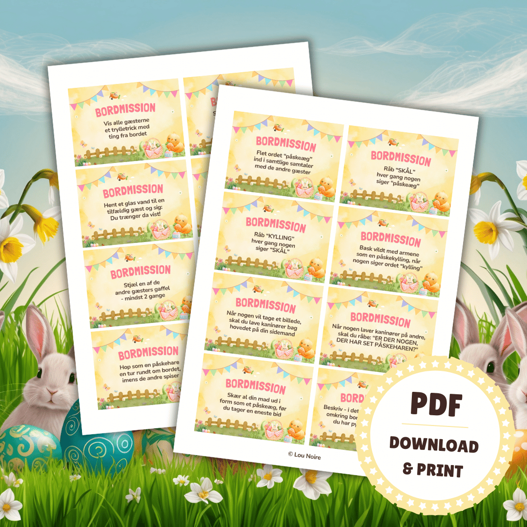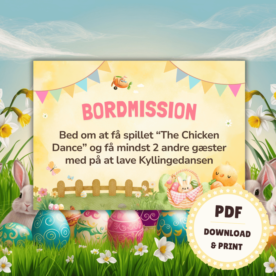 Bordmissioner til påskefrokost er en sjov festleg, hvor alle får en lille opgave under tallerkenen, som skal udføres i løbet af påskefrokosten. Mange kender legen under navnet “Seddel under tallerken”-leg, og den skaber en virkelig festlig stemning og masser af underholdning ved bordet.