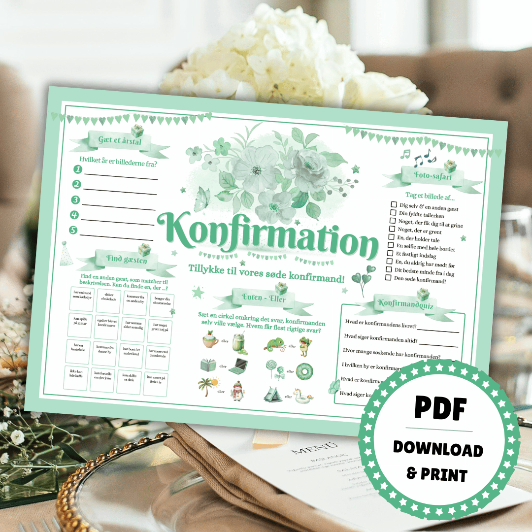 Dækkeservietten får gang i snakken mellem gæsterne med det samme. Den er nemlig fyldt med sjove festlege og spørgsmål om konfirmanden, som I kan quizze med på, imens maden serveres, konfirmanden hyldes, og gæsterne hygger sig. Her kan alle være med – uanset hvor godt man kender konfirmanden og hinanden.