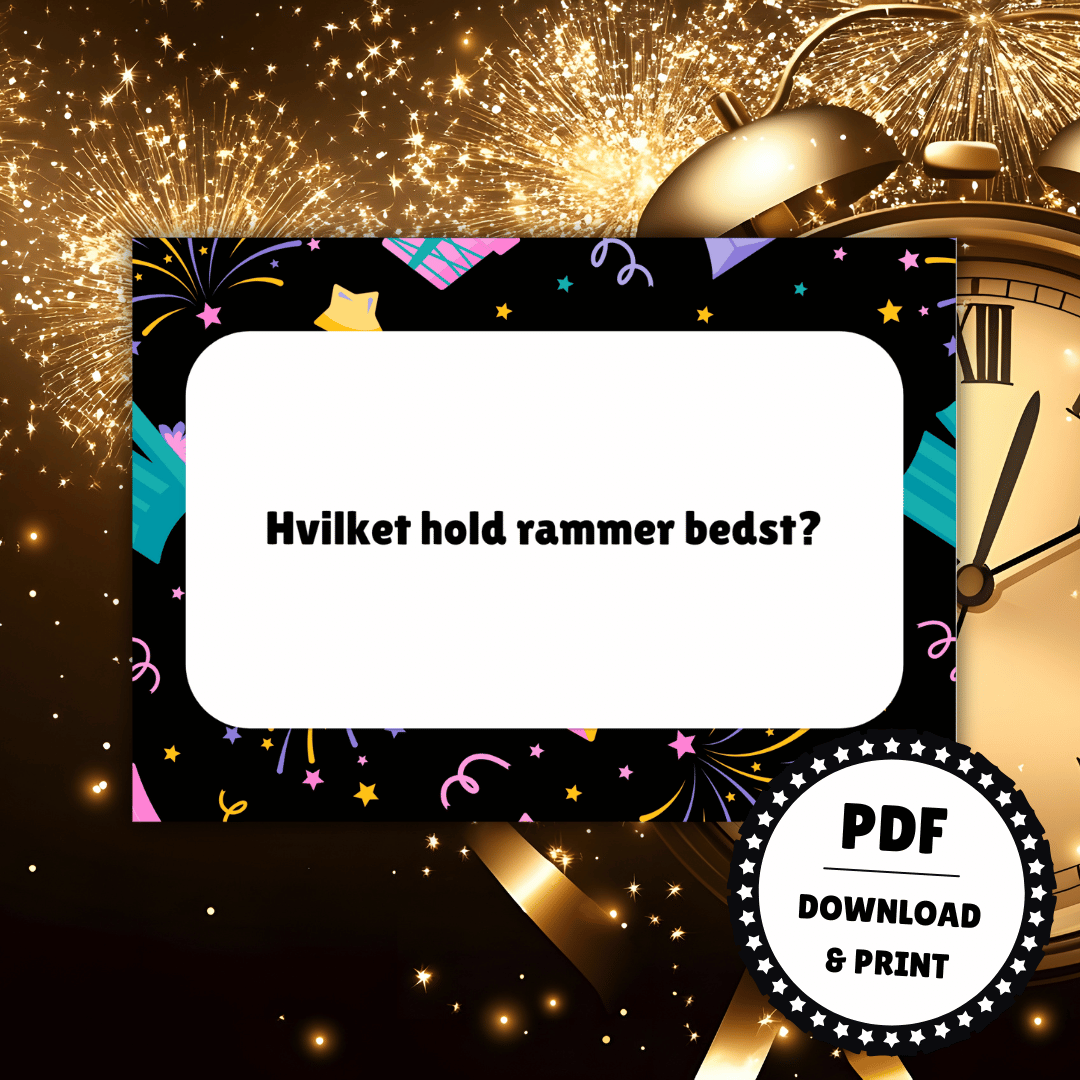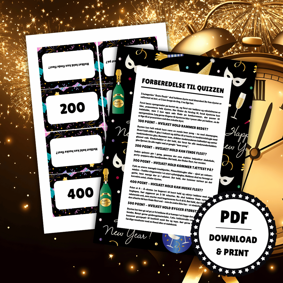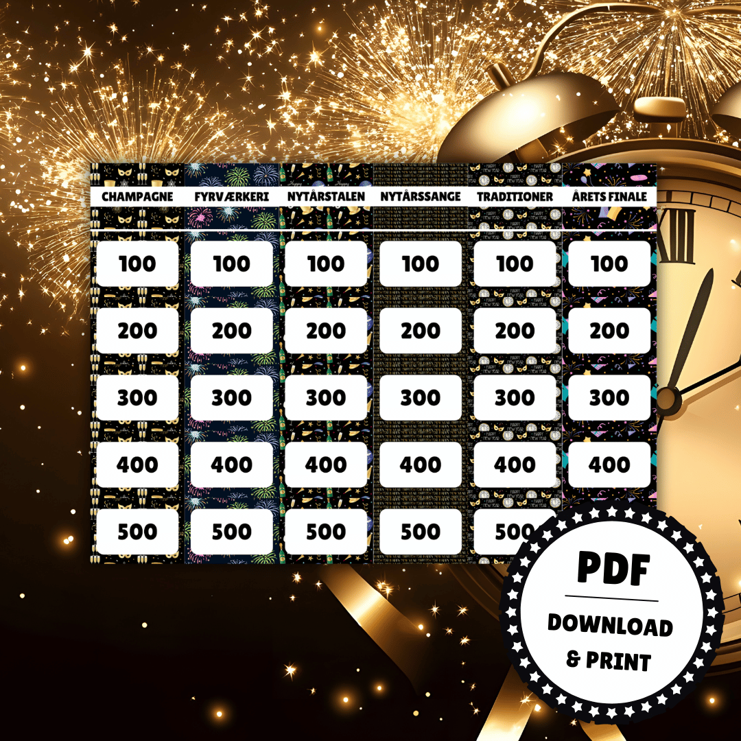 Pakken indeholder 6 forskellige kategorier, 30 spørgsmål om nytåret og alle traditionerne samt spillevejledning og svarark. Spillet er designet i PDF og er lige til at downloade og printe ud. PDF-filen kan ikke redigeres.