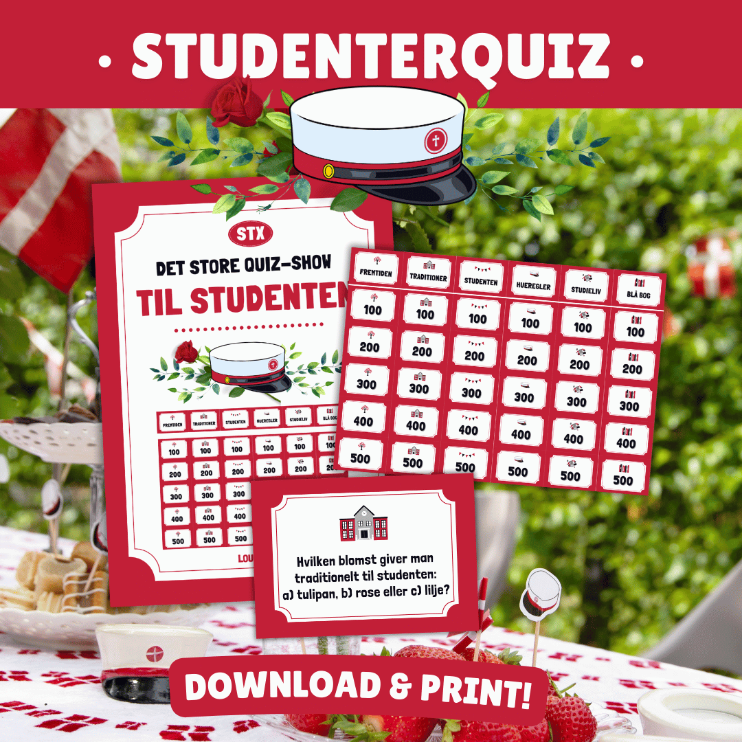 Min dejlige søn, som selv blev student for nylig, har hjulpet med at lave quizzen her. Vi var enige om, at vi ville lave en studenterquiz, der kunne passe til alle de forskellige typer studenter: de flittige, de festlige og alle dem midt imellem! Spørgsmålene i quizzen er altså udformet, så de passer til alle, uanset køn og karaktergennemsnit.