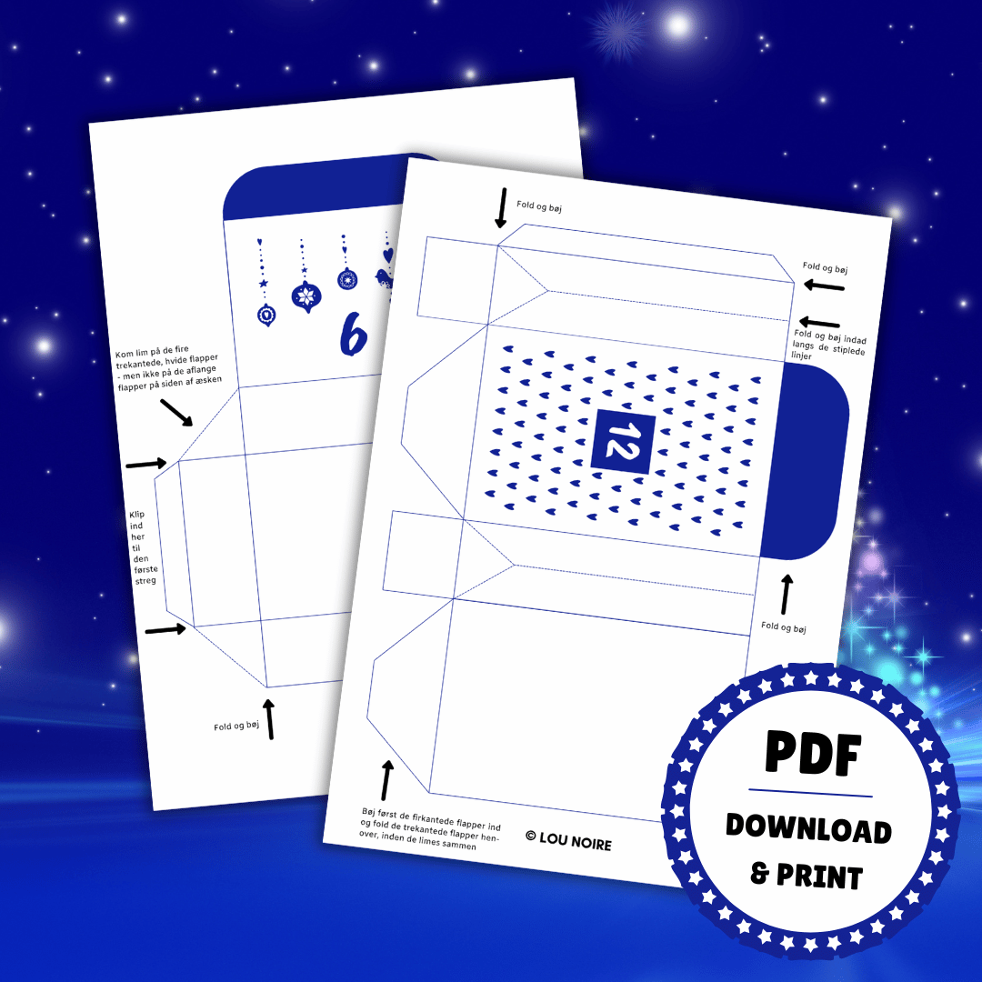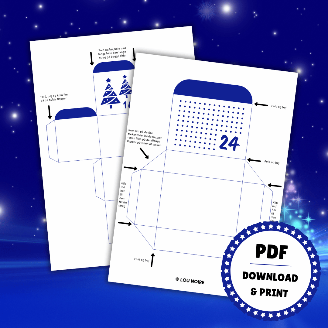 I pakken er der 24 bokse i 6 forskellige størrelser (fem æsker og en pose), som du kan fylde med små gaver og søde beskeder. Æskerne er holdt i et smukt blåt/hvidt design, nummereret fra 1-24. De julede æsker er designet i PDF og er lige til at downloade og printe ud. PDF-filen kan ikke redigeres.