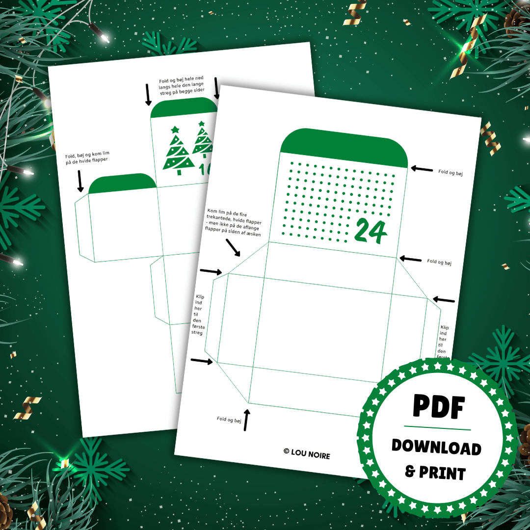 I pakken er der 24 bokse i 6 forskellige størrelser (fem æsker og en pose), som du kan fylde med små gaver og søde beskeder. Æskerne er holdt i et festligt grønt/hvidt design, nummereret fra 1-24. De julede æsker er designet i PDF og er lige til at downloade og printe ud. PDF-filen kan ikke redigeres.