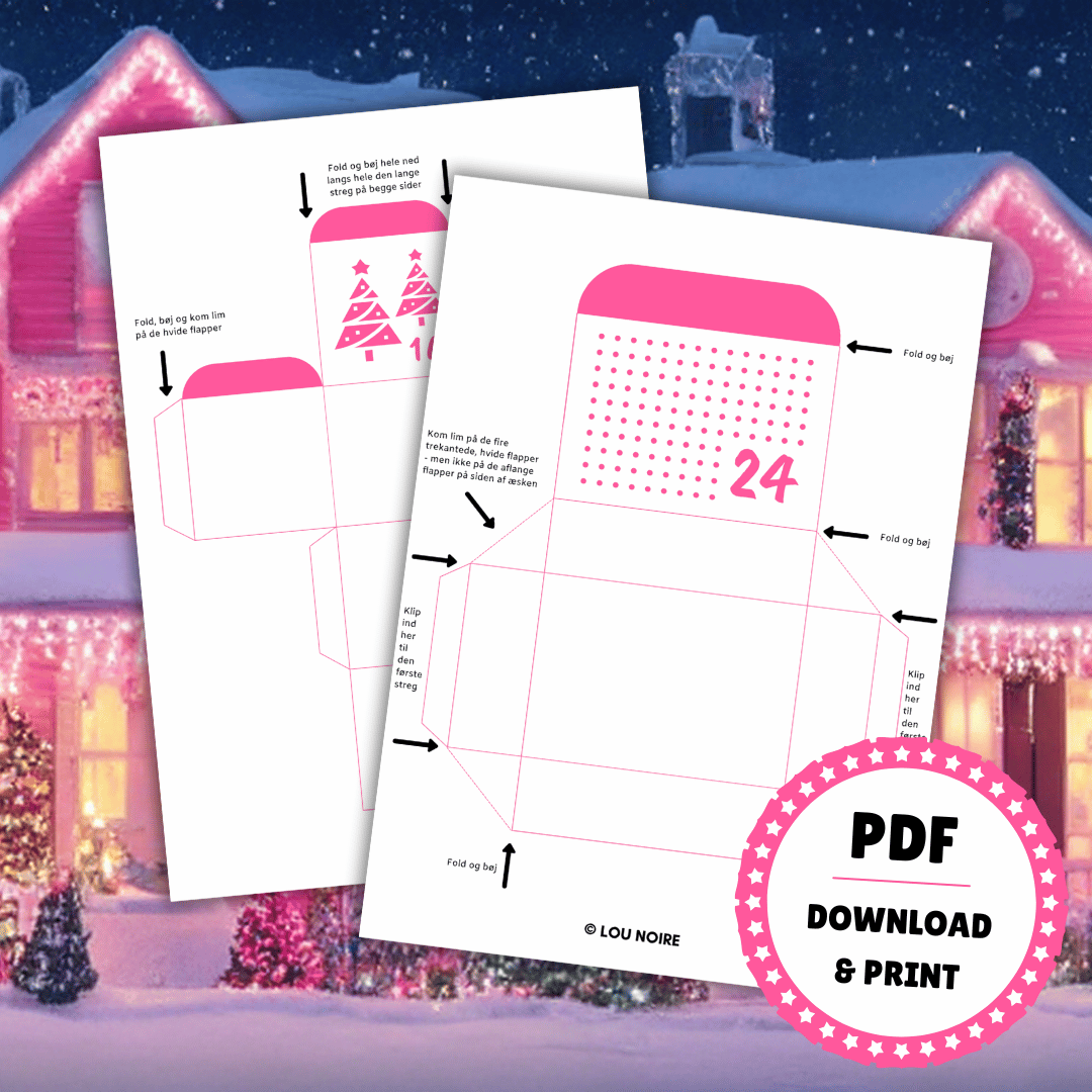 I pakken er der 24 bokse i 6 forskellige størrelser (fem æsker og en pose), som du kan fylde med små gaver og søde beskeder. Æskerne er holdt i et skønt lyserødt og hvidt design, nummereret fra 1-24. De julede æsker er designet i PDF og er lige til at downloade og printe ud. PDF-filen kan ikke redigeres.