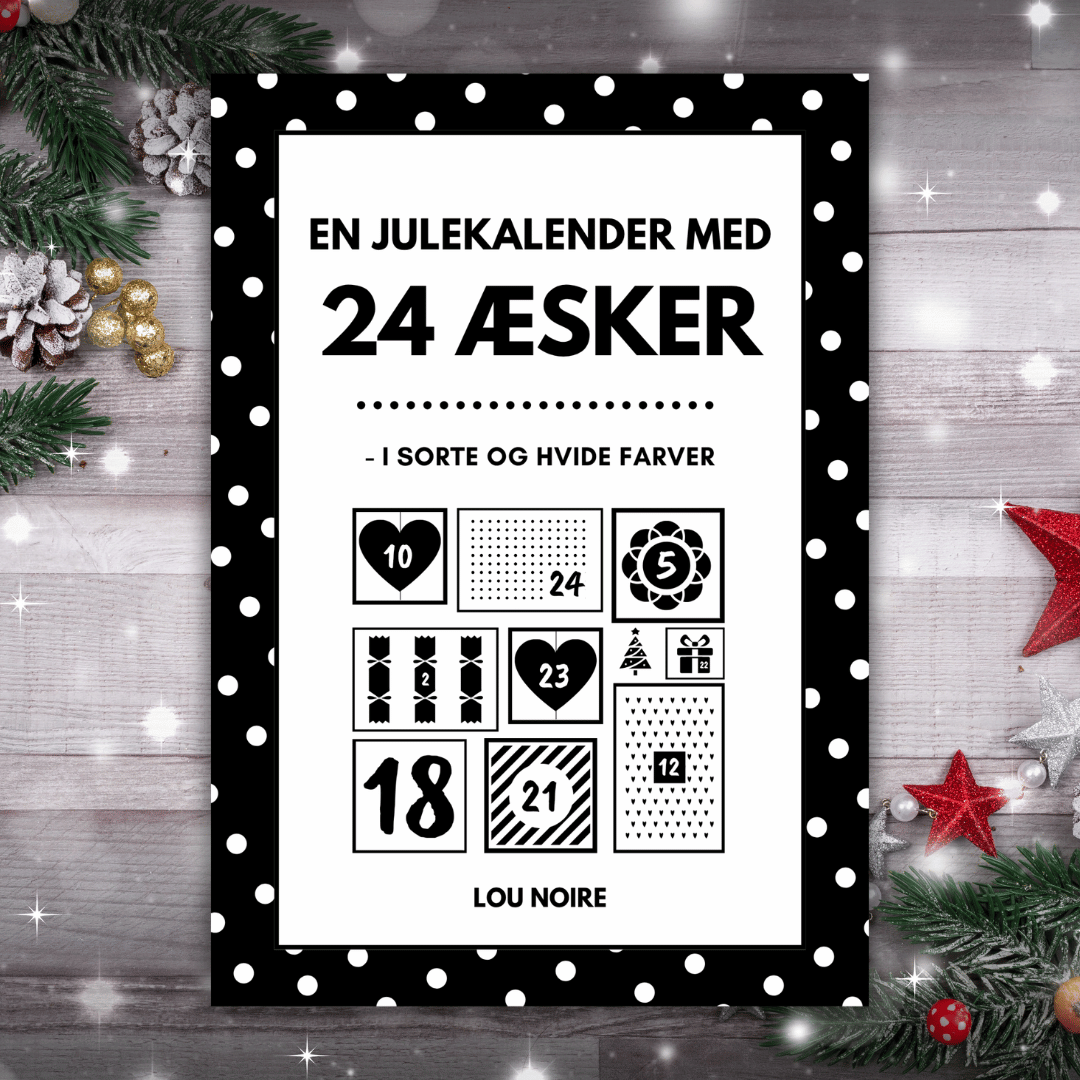 Titel: En julekalender med 24 æsker – i sorte og hvide farver – Forfatter: Lou Noire – Forlag: Pretty Page – Udgivelsesår: 2021 – 1. udgave – Format: PDF – 26 sider