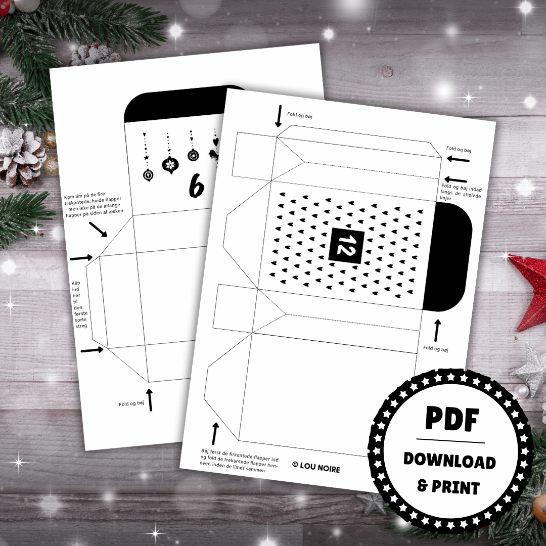 I pakken er der 24 bokse i 6 forskellige størrelser (fem æsker og en pose), som du kan fylde med små gaver og søde beskeder. Æskerne er holdt i et stramt sort/hvidt design, nummereret fra 1-24. De julede æsker er designet i PDF og er lige til at downloade og printe ud. PDF-filen kan ikke redigeres.