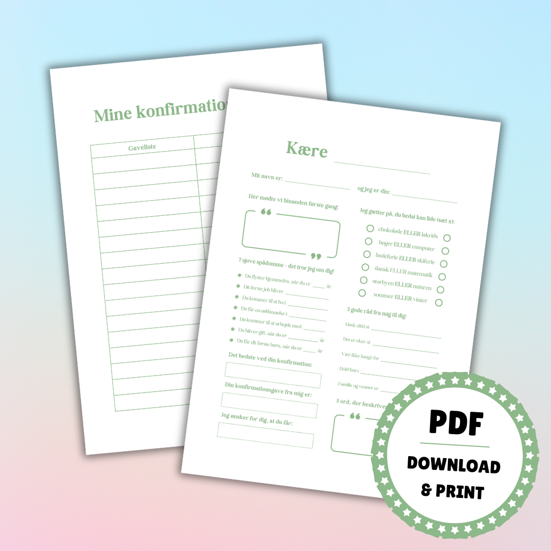 Print ét eksemplar af forside og bagside samt de første sider i gæstebogen. Den side, som gæsterne kan udfylde med gætterier, gode historier og kærlige minder, skal printes i så mange eksemplarer, som der kommer gæster til konfirmationen. Gavelisten printes efter behov. Print siderne ud i farver på A4-papir.