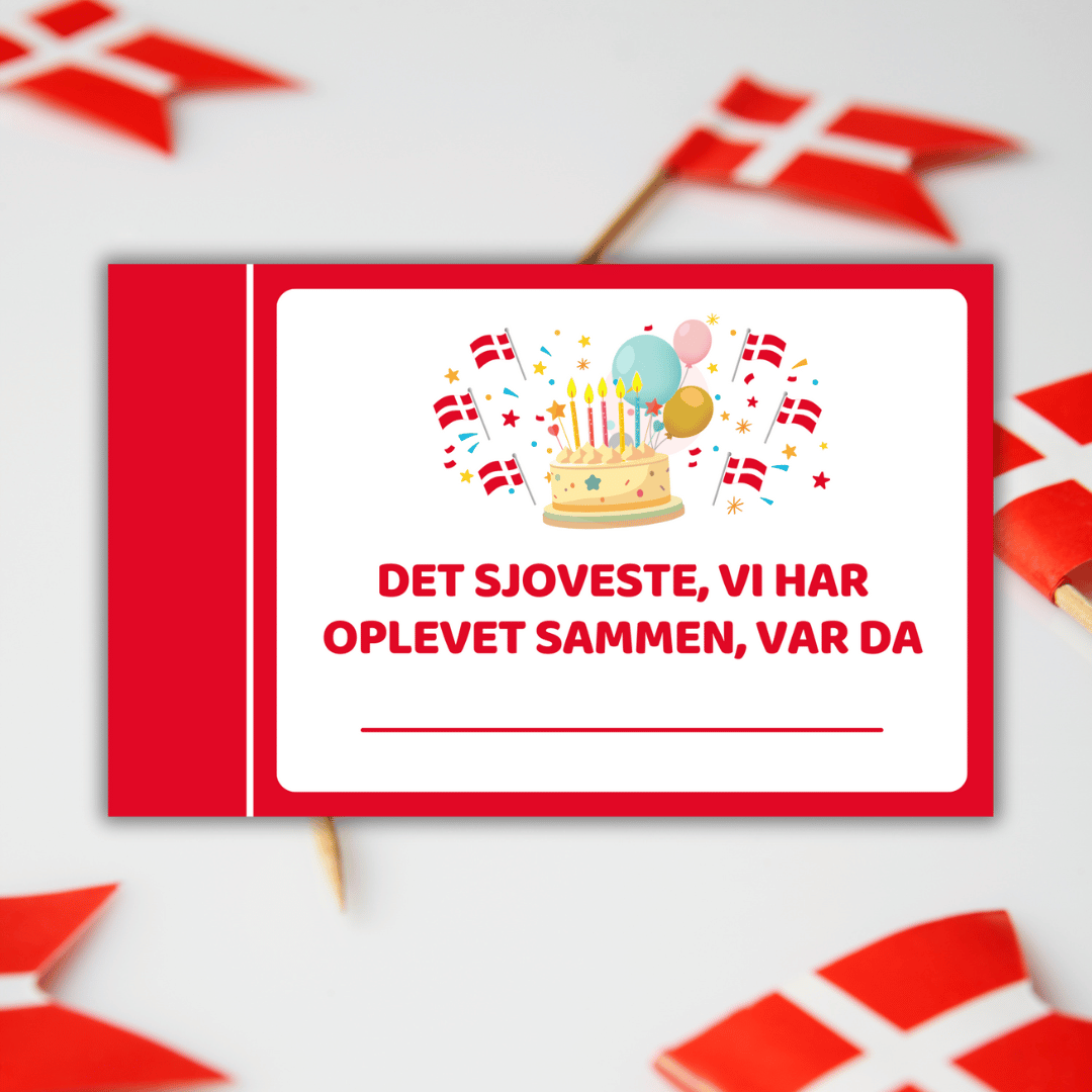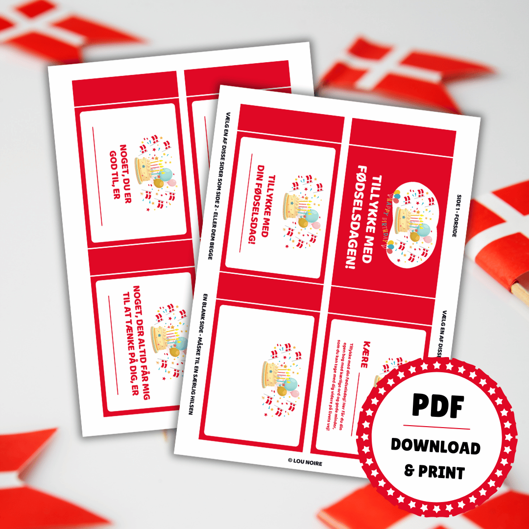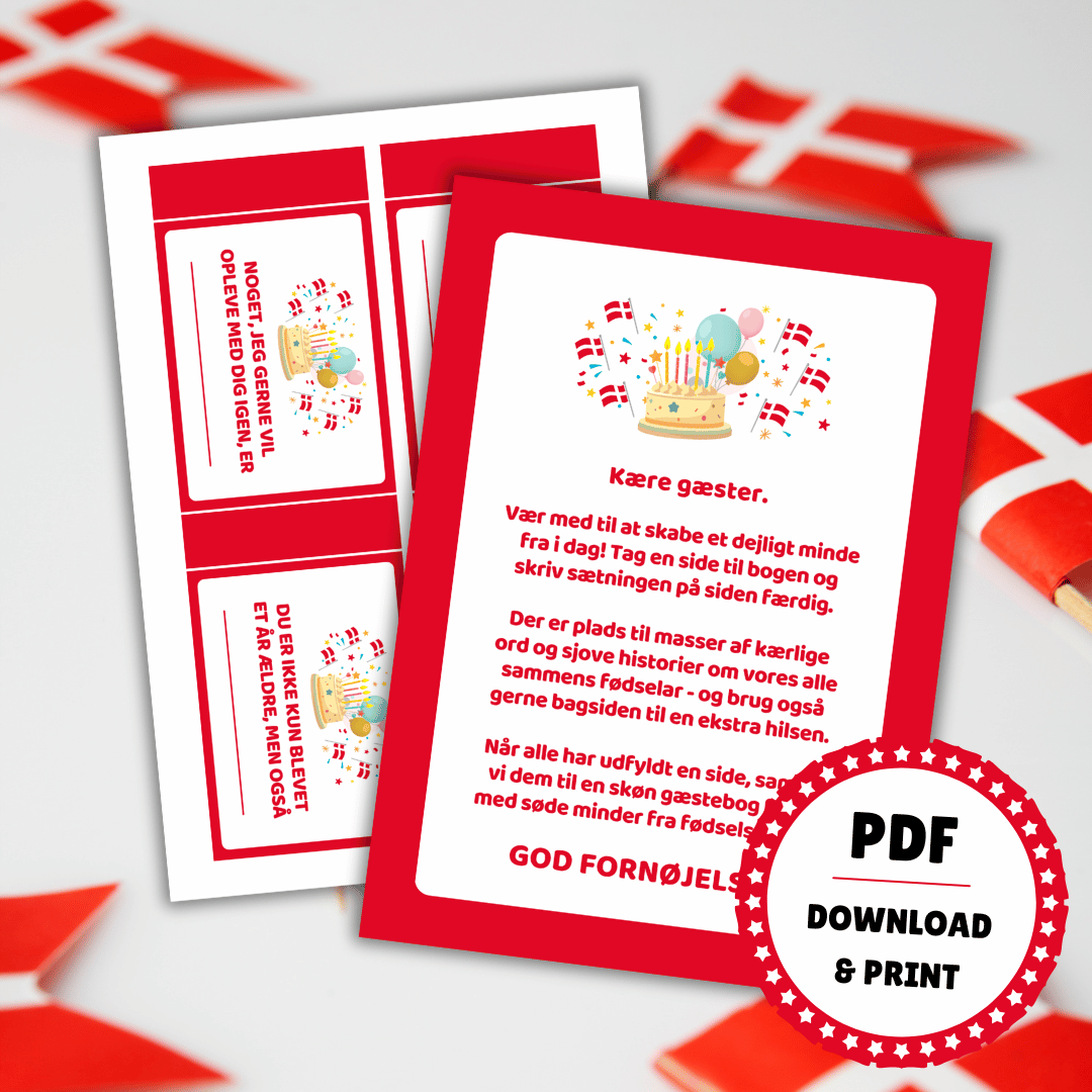 Den lille bog til fødselsdag kommer i en PDF-fil, som du modtager i din email-indbakke. For at få det bedste udskriftsresultat, kan du downloade PDF-filen og gemme den på din computer. Udskriv filen i farver på almindeligt A4-papir. Klip kortene ud – og så er de klar til at blive udfyldt!