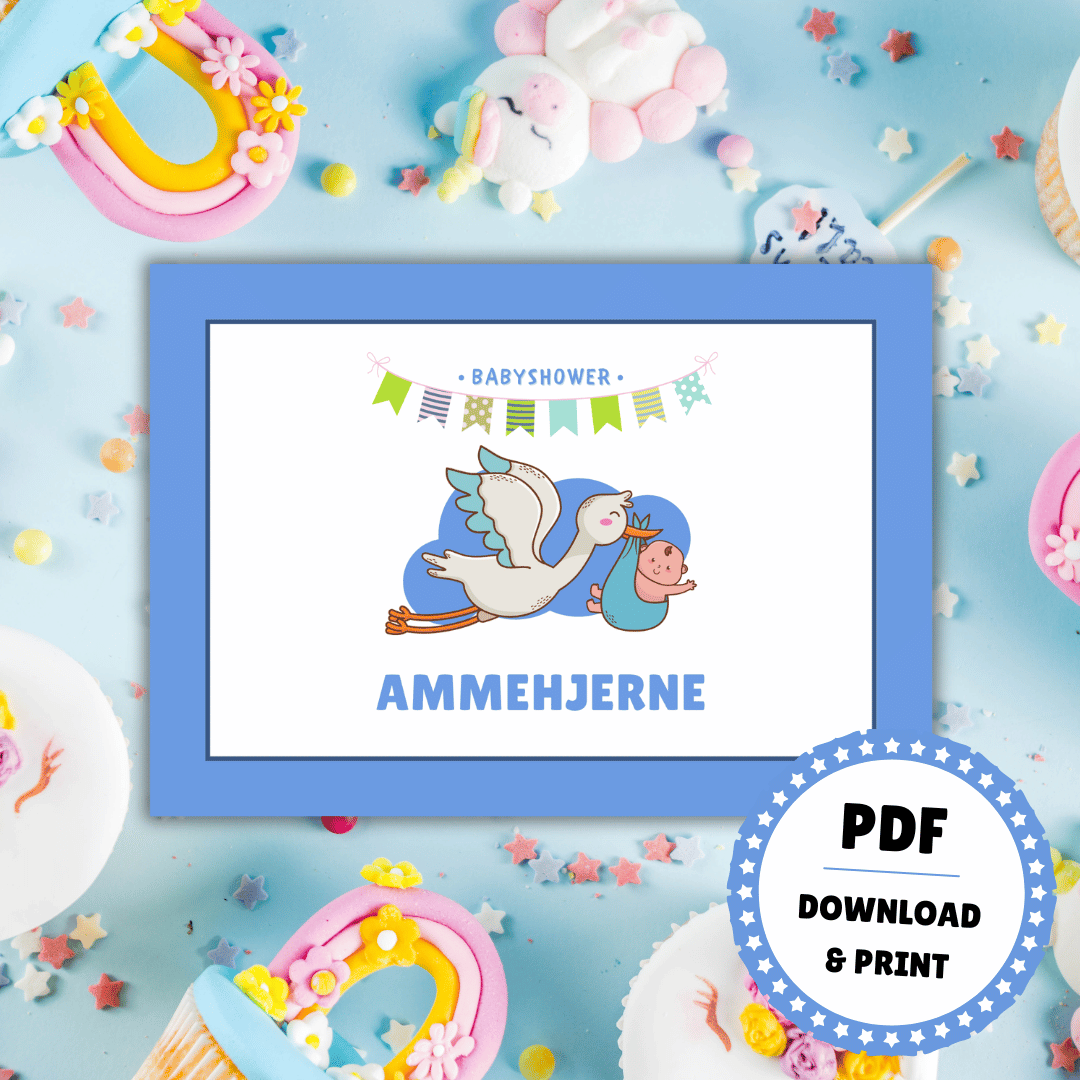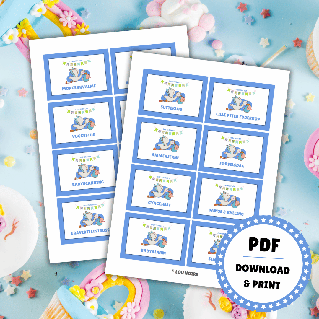 Pakken indeholder 50 forskellige kort med mange af de ord, der i forvejen flyver hen over bordet til et hyggeligt babyshower. Der er også blanke kort med i pakken, så I selv kan tilføje flere ord til legen. Spillet er designet i PDF og er lige til at downloade og printe ud. PDF-filen kan ikke redigeres.