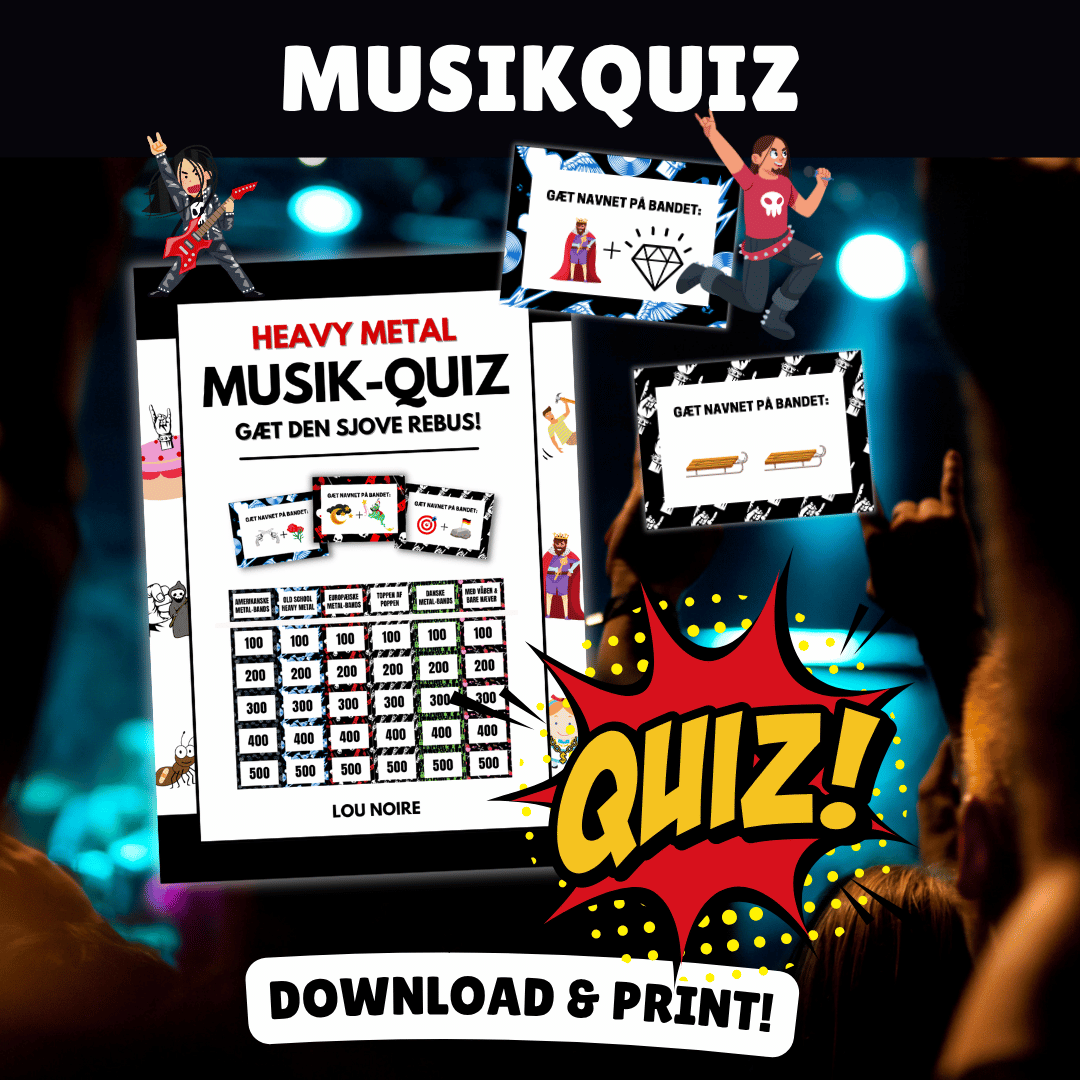 Quizzen indeholder 6 forskellige kategorier, 30 spørgsmål om danske og udenlandske metalbands samt spillevejledning og svarark. Spillet er designet i PDF og er lige til at downloade og printe ud. PDF-filen kan ikke redigeres.