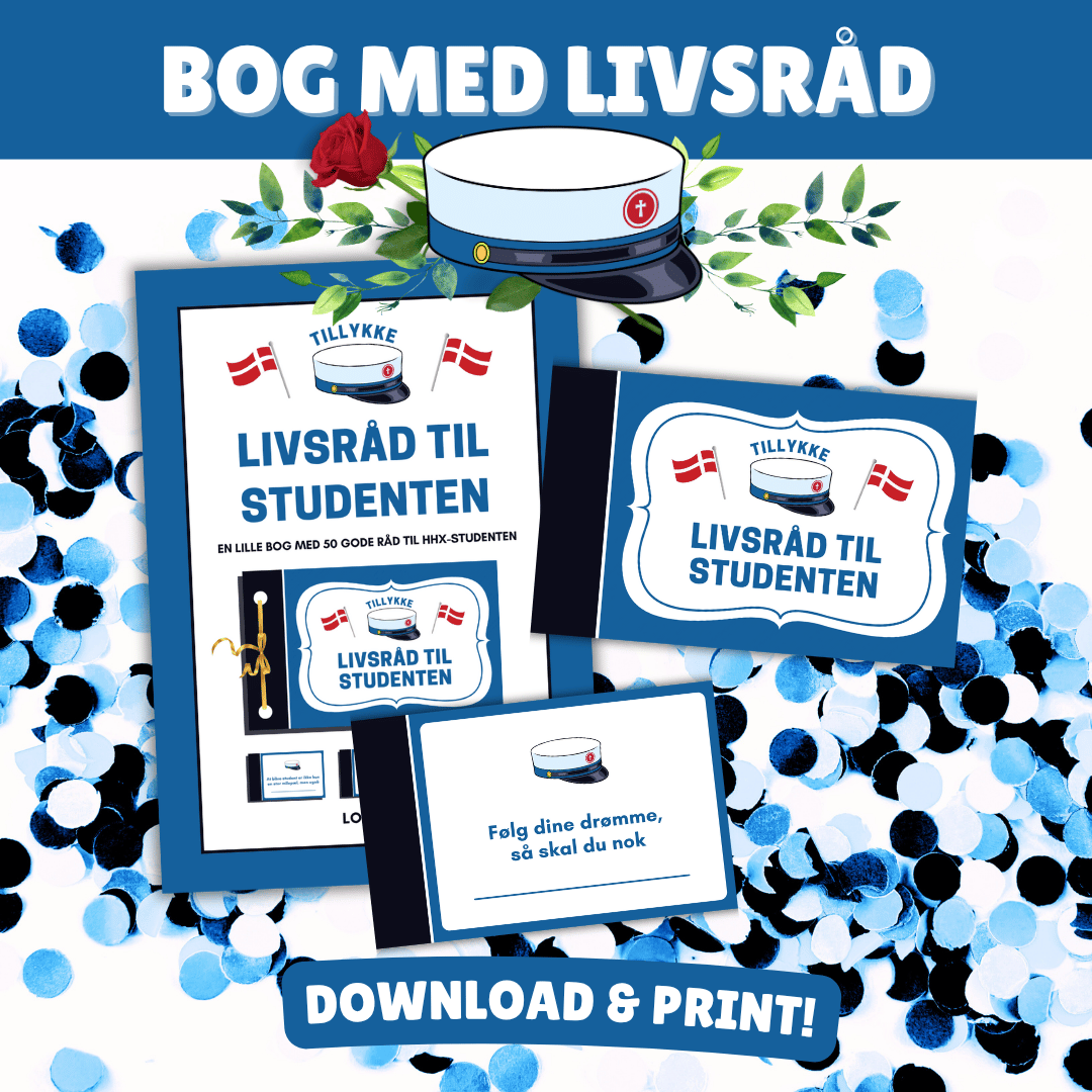 I pakken får du 50 kort til den lille bog (samlet ca. 8,5 x 13,5 cm). I pakken er der også en forside, en side med et “Tillykke med din eksamen!” og “Tillykke med huen STUDENT!” samt en side, hvor du kan skrive navnet på studenten. Der er også blanke kort med i pakken, hvis du selv har lyst til at forfatte flere kloge livsråd.