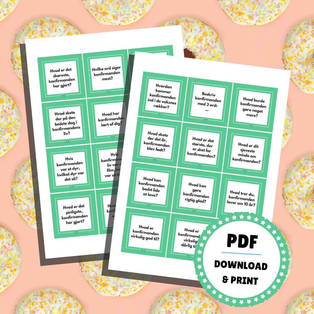 På skift trækker gæsterne et spørgsmål og giver sit bud på svaret. Det er konfirmanden selv, der afgør, om svaret er korrekt. Hvis du er heldig, er der en præmie for et rigtigt svar, og du kan f.eks. medbringe små chokolader eller andre gevinster.