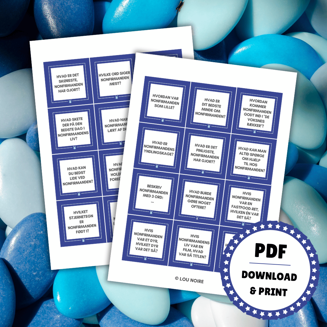 Titel: Samtalekort til nonfirmation – blå : 100 sjove spørgsmål til nonfirmanden – Forfatter: Lou Noire – Forlag: Pretty Page – Udgivelsesår: 2022 – 1. udgave – Format: PDF – 12 sider