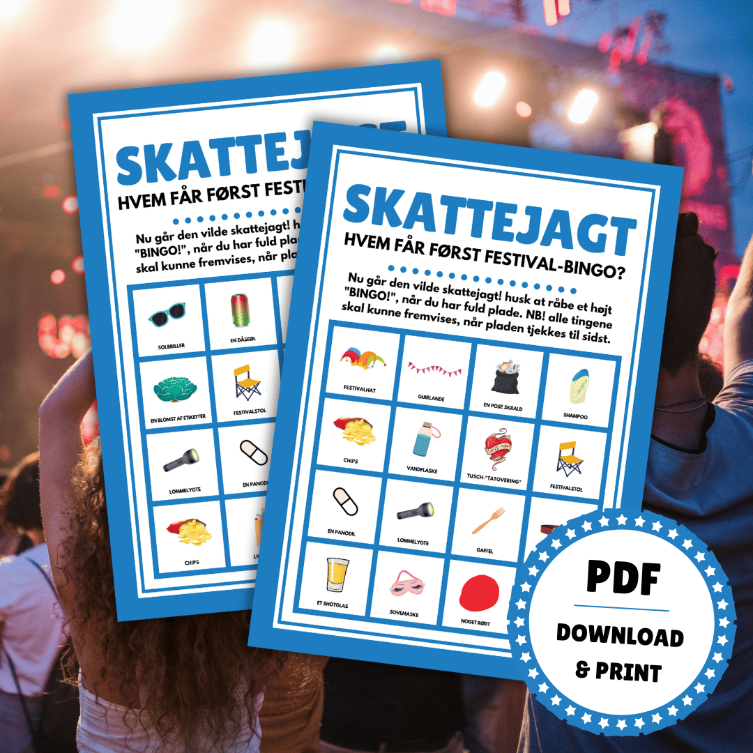 I kan også spille en almindelig gang bingo. Klip de 50 opråberbrikker ud. Opråberen trækker nu et billede og råber f.eks. “Festivalhat”. Har man en festivalhat på sin spilleplade, må man nu dække denne til. Når brikken “Shotsglas” trækkes ud, drikker alle et shot – selvfølgelig!