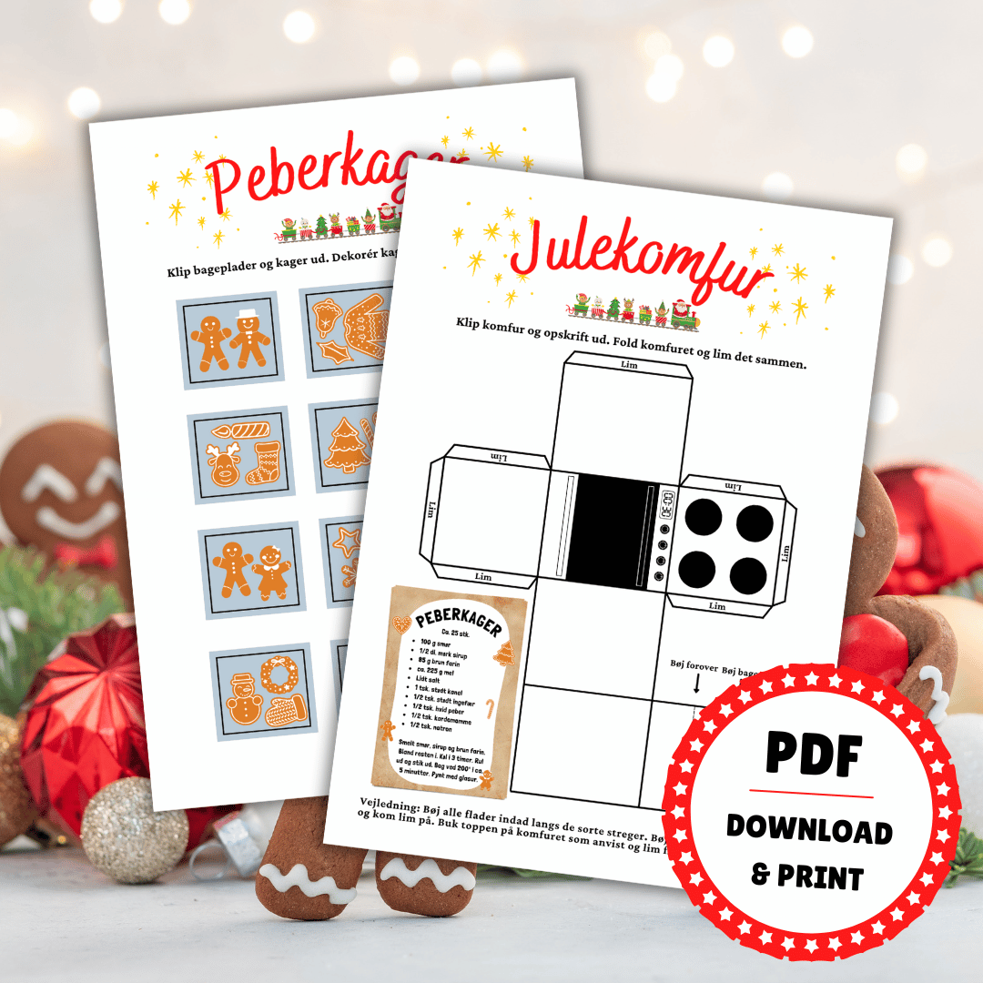Print det hele ud i farver på A4-papir. Klip, fold og lim, og stil det lille komfur foran nissedøren. Læg bagepladerne klar – så er der nissebag næste morgen!