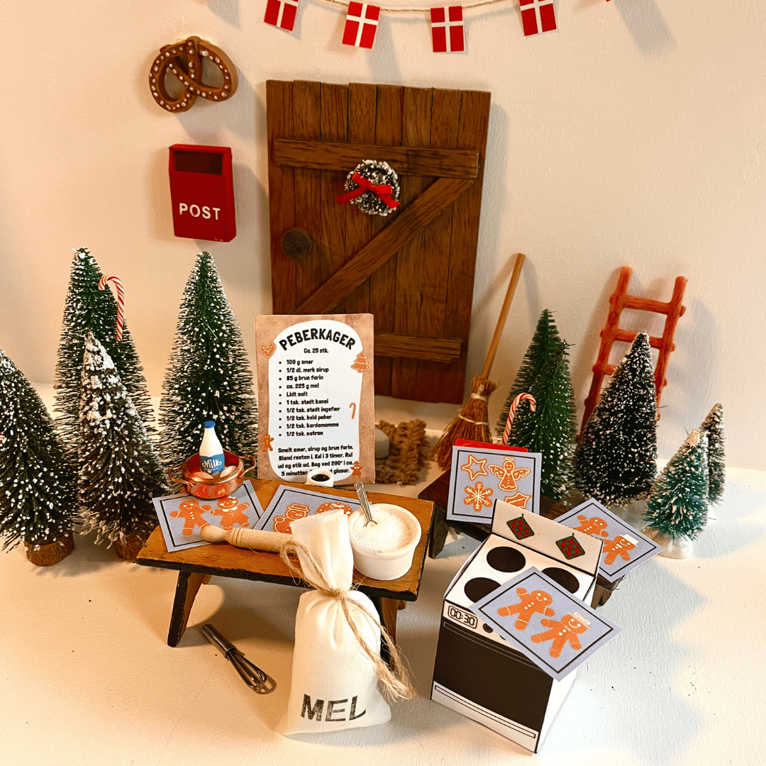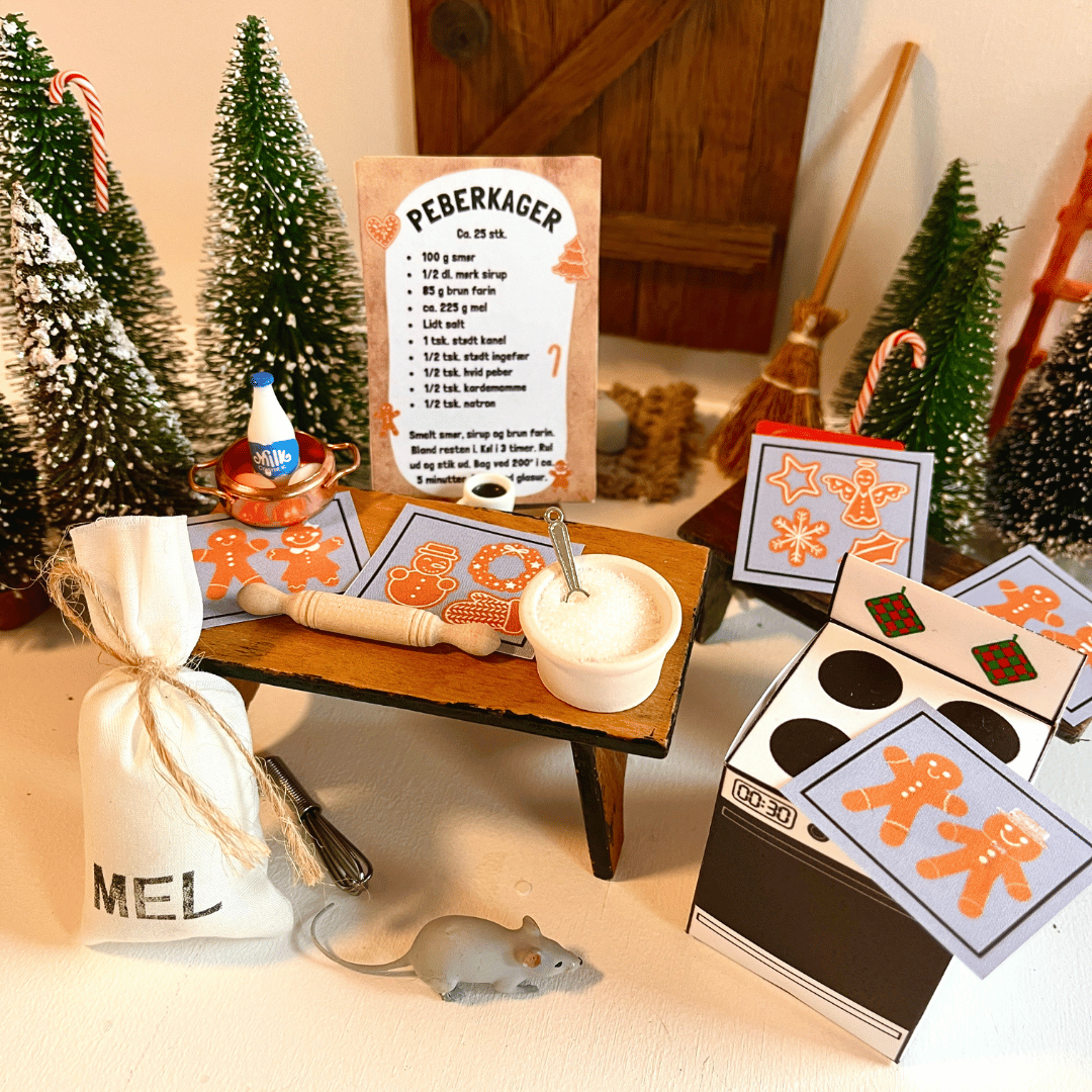 Børnene kan også bage sammen med Nissen! Sæt det lille komfur op foran døren, find et dukkehusbord frem og læg en minikagerulle klar. Strø lidt mel på bordet, så det ligner, at Nissen lige er gået i gang med dejen. Når alt er gjort klar, kan Nissen bage sine festlige julekager i nattens løb.