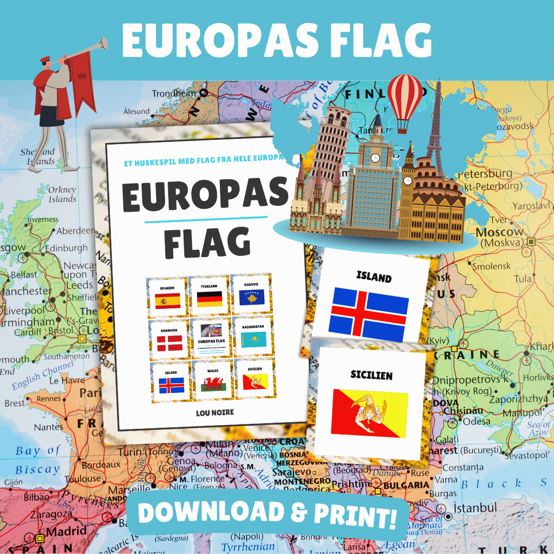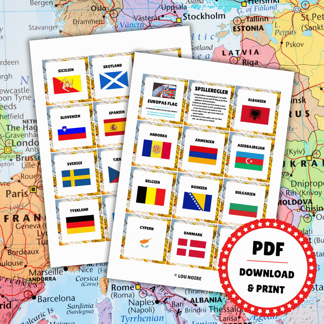 Spillet kan både bruges som flashcards, hvor du lærer alle de farvestrålende flag udenad, imens du kører kortene igennem. Er I flere, der skal spille det sjove huskespil med Europas flag, så printer du bare to sæt ud. Så har du spillebrikker til et morsomt og lærerigt spil.